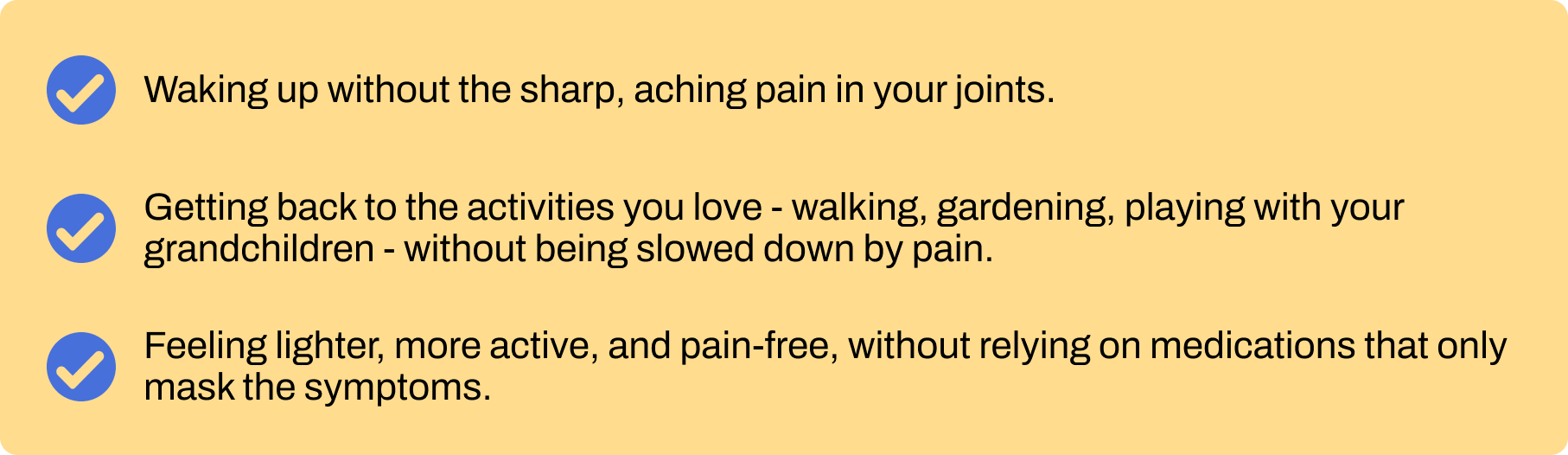 “I’ve struggled with joint pain for years. Back, hips, shoulders. I was close to surgery for my shoulder, ached constantly. These pains have subsided and my range of motion has improved.”