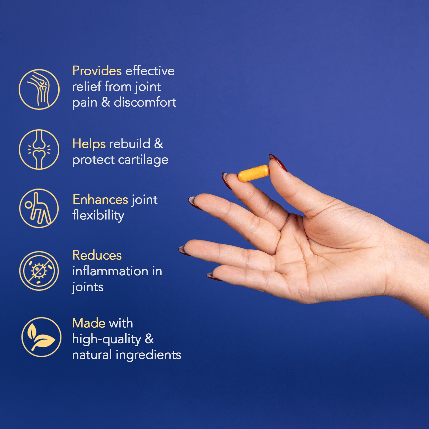 Glucosamine is a naturally occurring amino acid that can be found in the body and has been shown to have anti-inflammatory effects. It also helps with pain relief, functions as an antioxidant, improves muscle function, and increases mobility.