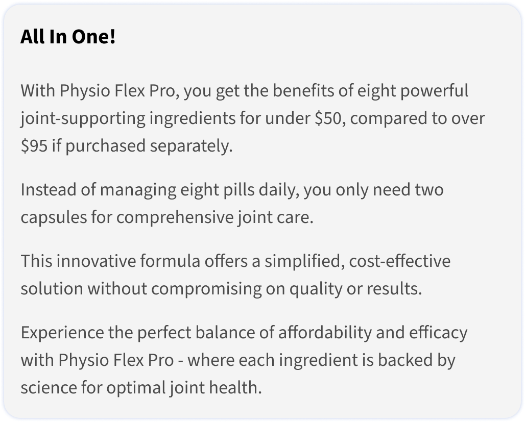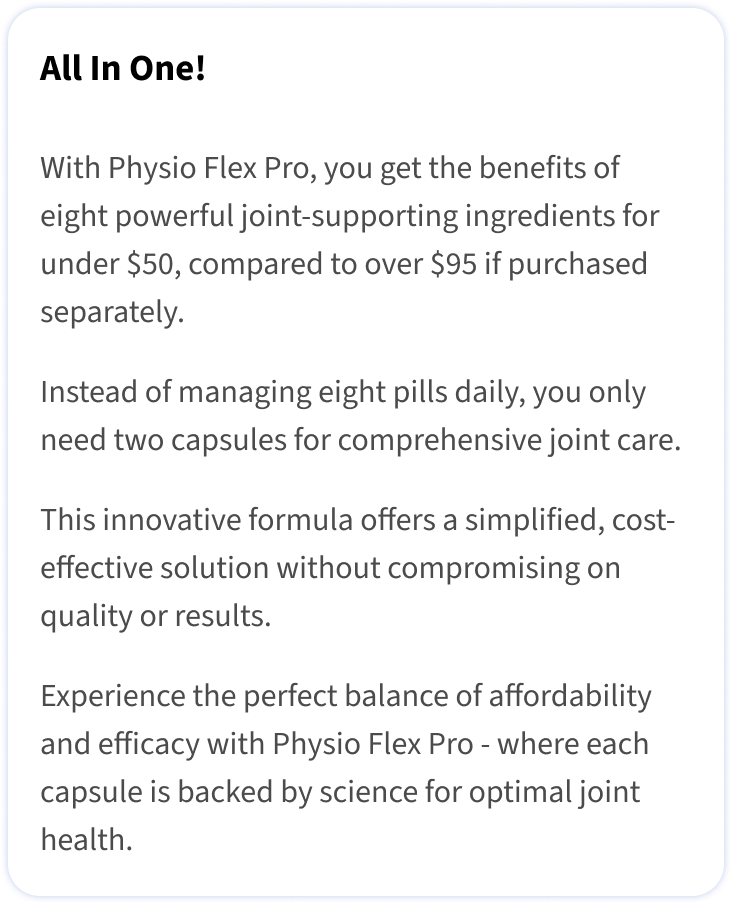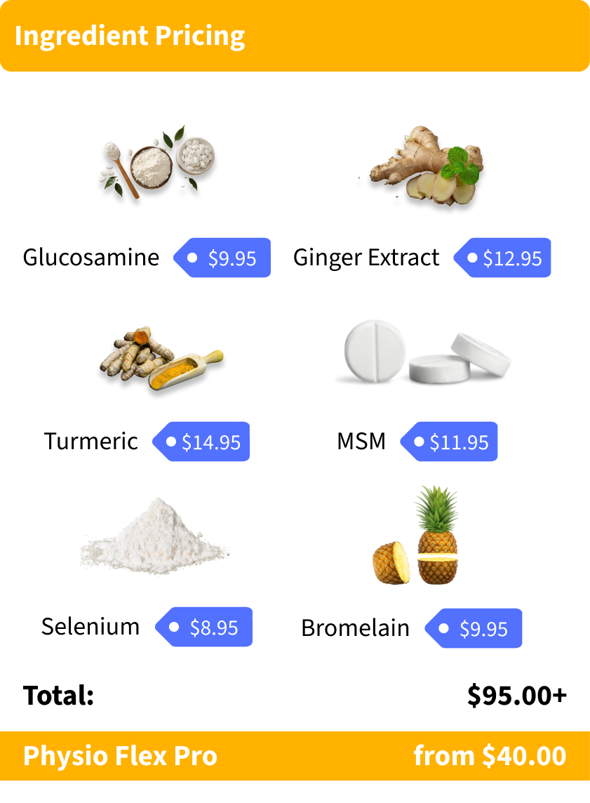 Physio Flex Pro uses 500mg of Glucosamine based on research that found glucosamine effective for the reduction of osteoarthritis symptoms and healthier function within joints.