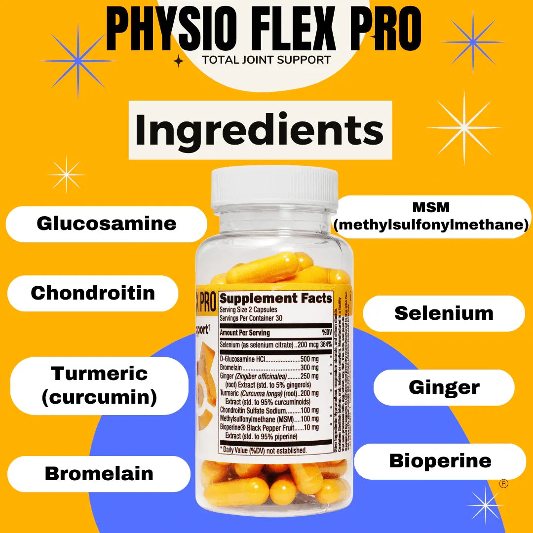Physio Flex Pro uses 500mg of Glucosamine based on research that found glucosamine effective for the reduction of osteoarthritis symptoms and healthier function within joints.